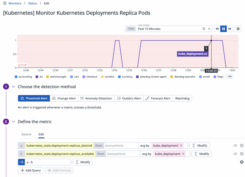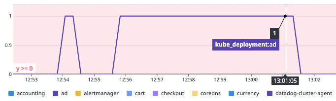 Under Define the metric, the metric query for this monitor is the difference between the number of deployment replicas desired vs number available. You can see from the graph that the kube_deployment:ad pod was at 1 (i.e. when the pod was stuck at pending state) before and now it has returned to 0.