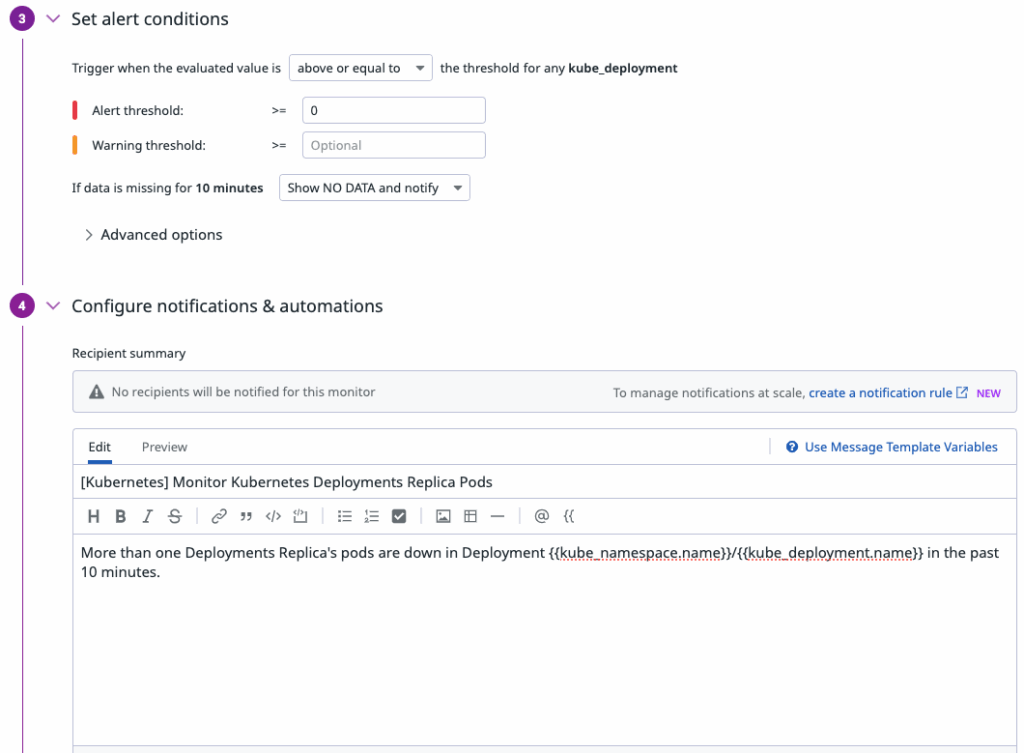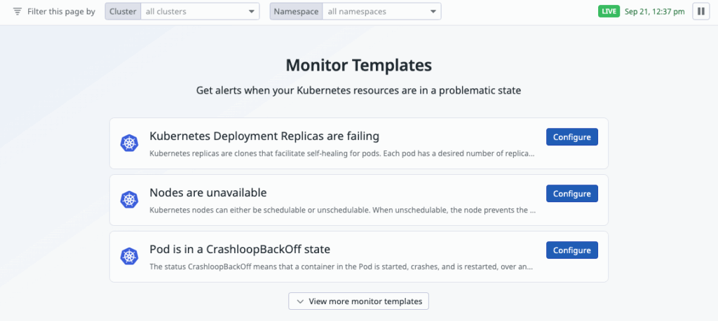 Let’s create a monitor and get alerts if similar issues recur to help us fix them more quickly. Datadog provides many built-in monitoring templates. Navigate to Kubernetes Overview > Monitors Templates section: