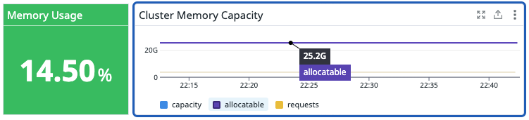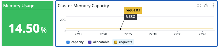 Hover over the allocatable line in Cluster Memory Capacity graph, you can see that the cluster has 25.2G memory available but only 3.65G memory was being requested. So there should be enough capacity for the ad service.