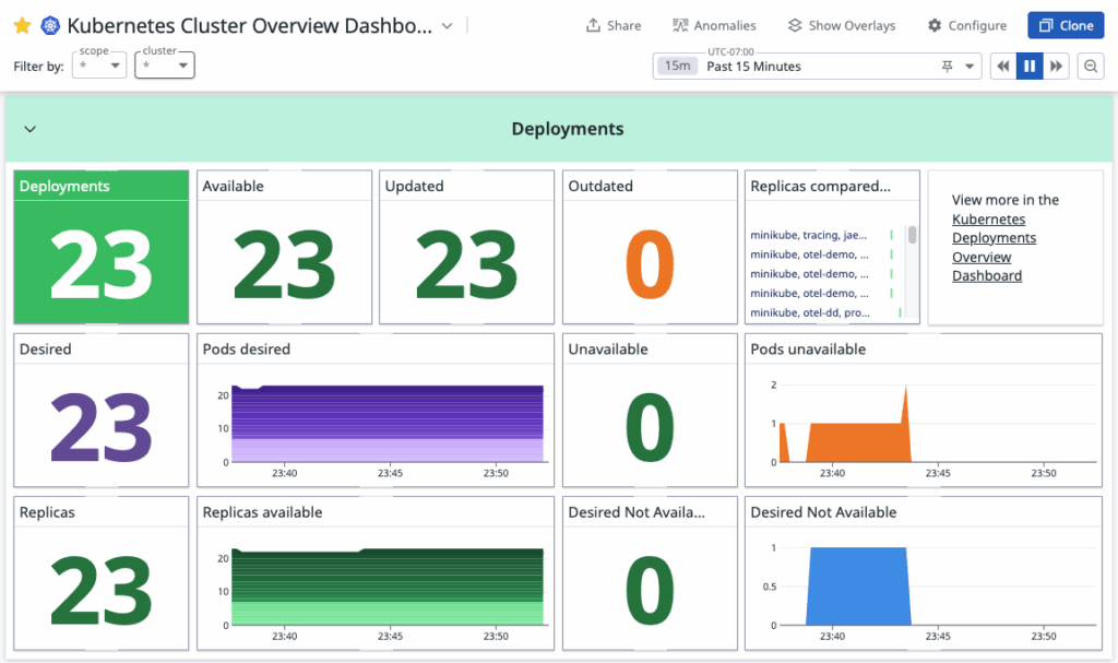 Return to the Kubernetes Cluster Overview Dashboard, under the Deployment section we can confirm the issue is fixed and all pods are up and running because the number of Desired pods equal to that of Available (i.e. 23)