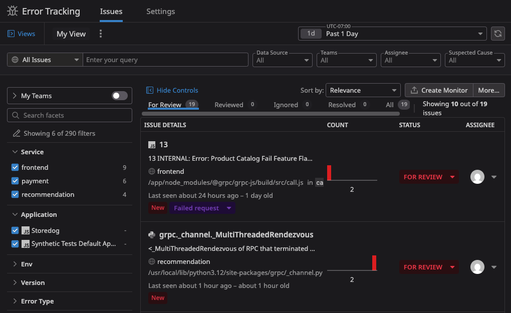APM + Error Tracking — Group exceptions by signature, tie spikes to releases and services, jump straight into traces and span‑based metrics to see where time is spent.
