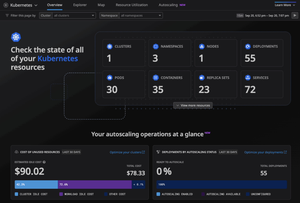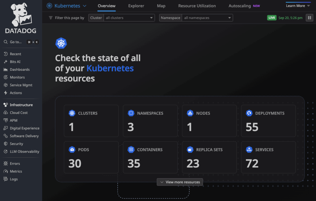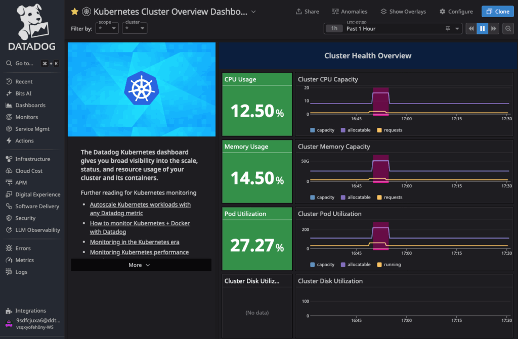 Datadog gives you a Kubernetes-native, cross-signal view – metrics, logs, traces, and events all in one place with the cluster context like nodes, namespaces, deployments and pods baked in. You can pivot from infrastructure → workload → service → code in a couple of clicks, correlate symptoms with changes, and drive down Mean Time To Repair (MTTR) without bouncing between tools.