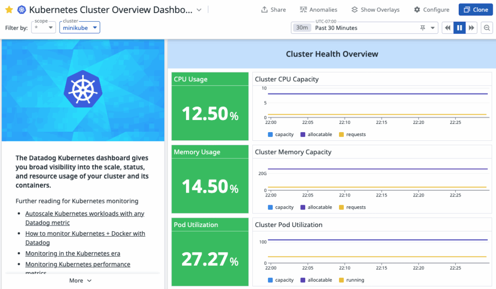 Datadog provides lots of tools to help you monitor and troubleshoot workloads running in Kubernetes clusters. The Kubernetes Overview provides a high-level view of your cluster’s health and performance. It’s a great starting point for troubleshooting, as it shows the summary status of your cluster’s nodes, and pods.