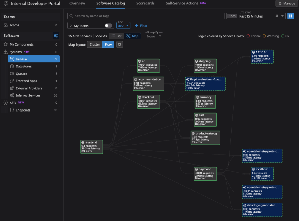 Switch to Map view and change Map layout to Flow to see the service topology and dependencies