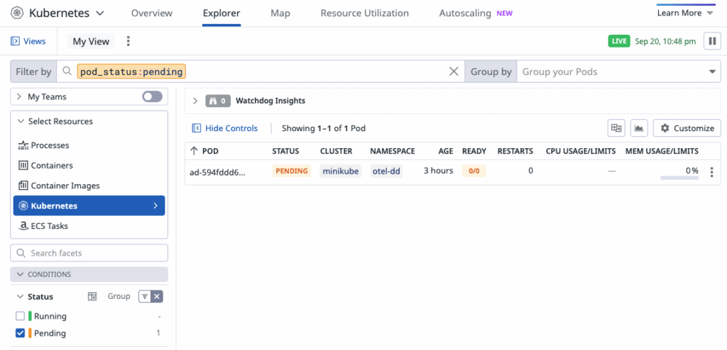 Our cluster is healthy and has enough memory to run the ad service. Why it is reported that the node has insufficient memory? Let’s look at the pod’s spec to confirm that it’s requesting a reasonable amount of memory. Navigate to Kubernetes Explorer > Pod, use the facets panel on the left click Pending in Status to show only resources in pending state.
