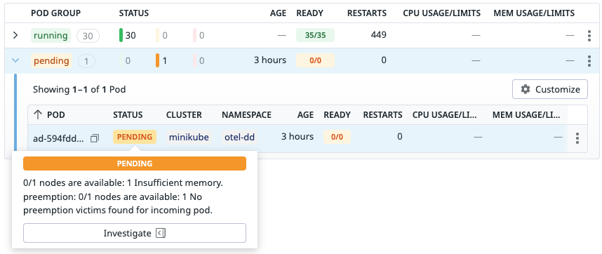 Navigate to Kubernetes Explorer, click on Pods and see the Pending Pod Group, you can tell that there’s an issue with the ad service. Hover over the PENDING status to see why the pod is stuck – Insufficient memory.
