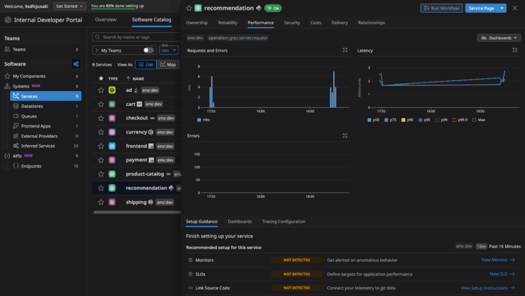 Select a service (e.g. recommendation) to view its performance metrics (like requests throughput, latency, errors) in a side panel without leaving the page