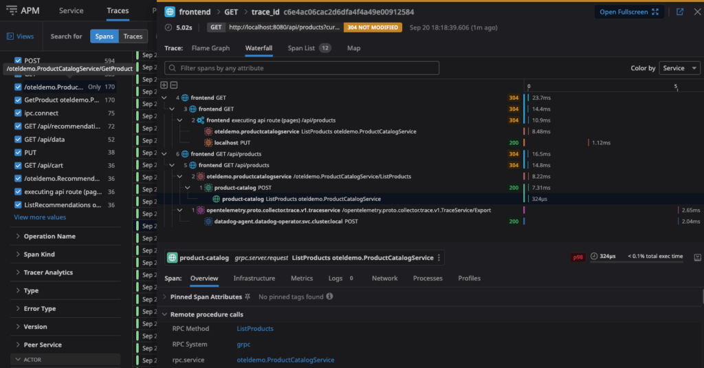 This patches app services only (not infra like Kafka/Redis/loadgen) and points them to Datadog Agent’s in‑cluster OTLP gRPC endpoint. It also disables built‑ins (i.e. Grafana, Jaeger, Prometheus, Opensearch) we won’t use in this datadog approach.