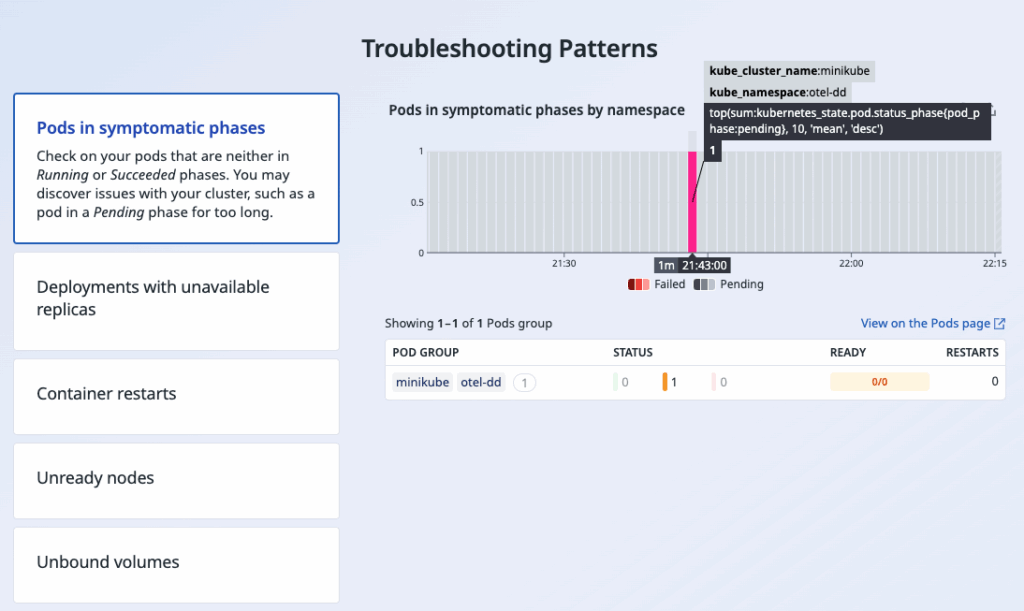 Look at the Troubleshooting Patterns section and hover over Pods in symptomatic phases graph, there is one pod that is stuck in pending state.