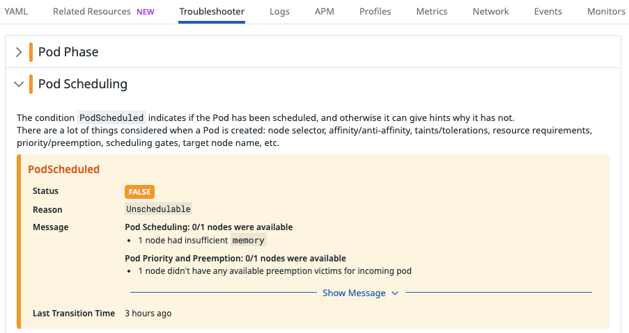 Click Investigate to open the pod’s Troubleshooter tab. It gives you more comprehensive explanation of the scheduling problem. In this case our minikube cluster needs more memory resources to run the advertisement service.