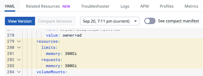 Click on the pending pod (i.e. ad-594fddd6.) to see the details. Navigate to the YAML tab to inspect its metadata and spec. When we scroll down to the resources section, we can see that the pod is configured to request 300Gi memory, which far exceeds the allocatable memory in our cluster, and clearly this is a typo.